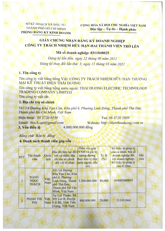 CÔNG TY TNHH TM KỸ THUẬT ĐIỆN THÁI DƯƠNG