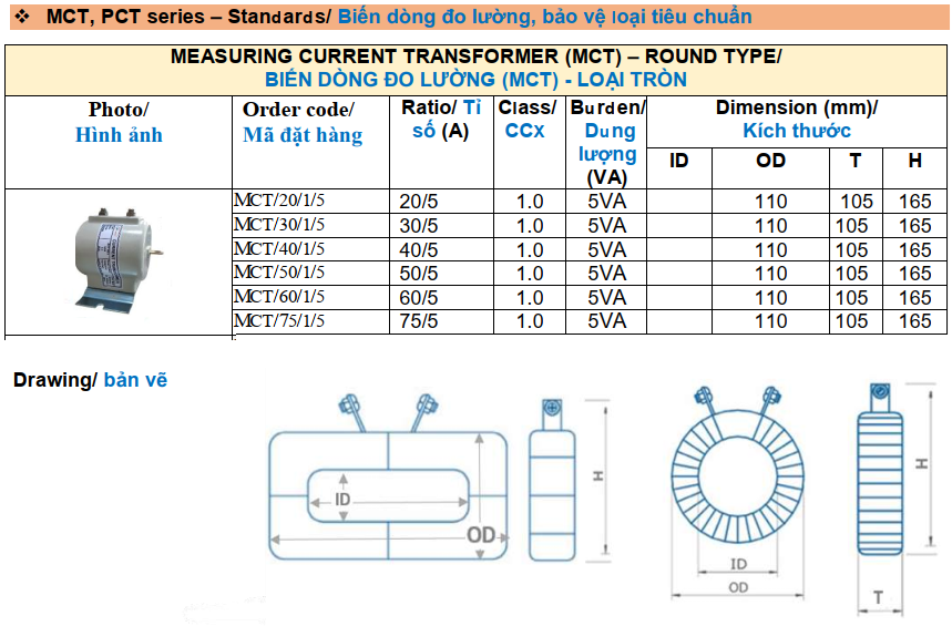 - Tiêu chuẩn áp dụng : IEC60044-1, IEC61869, EN60044-1, VDEO414-44-1, BS7626,