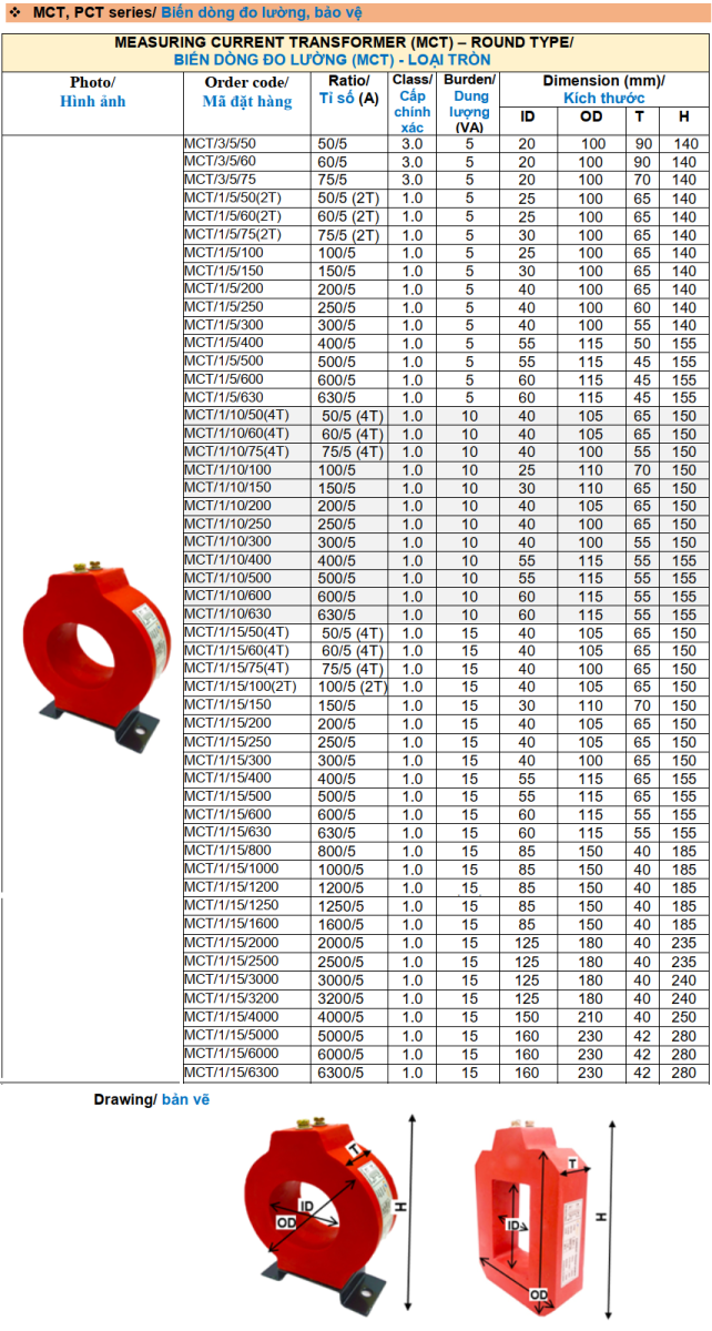Kích thước Biến dòng loại MCT đúc EPOXY tròn của MASTER: