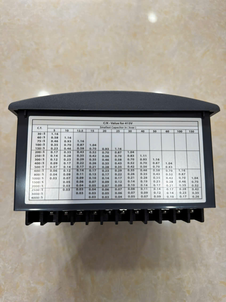 - Thông số hiển thị: Hệ số COSφ; Dòng điện; Điện áp: CS tiêu thụ (W); CS phản kháng (VAr); CS biểu kiến (VA); VAR cần bù; Sóng hài (THDI & THDU). Có thể lập trình TẮT tất cả các cảnh báo.