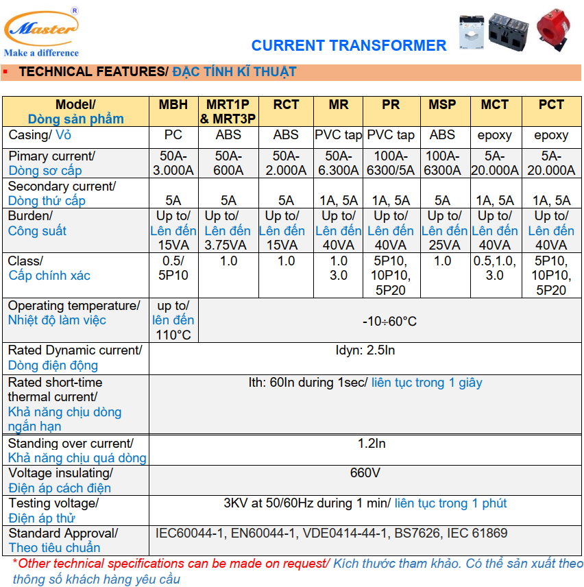 - Tiêu chuẩn áp dụng : IEC60044-1, IEC61869, EN60044-1, VDEO414-44-1, BS7626,