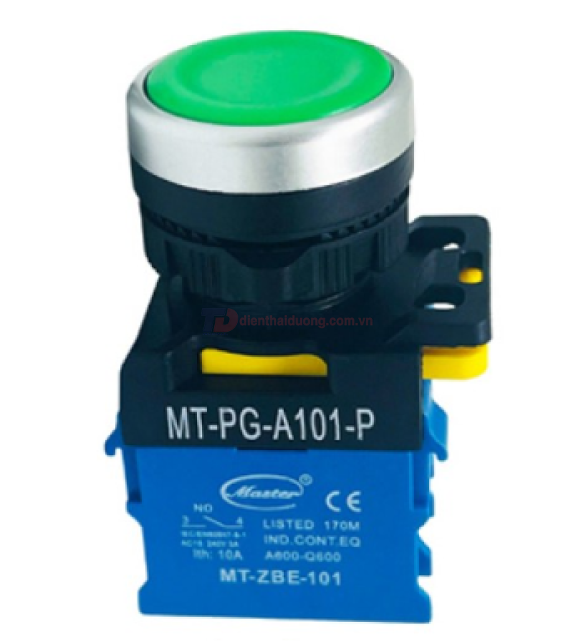 Nút nhấn ON MASTER màu xanh lá Ø22 MT-PG-A101-P loại tự nhả viền màu bạc