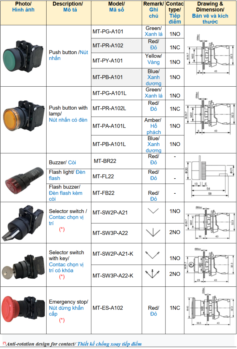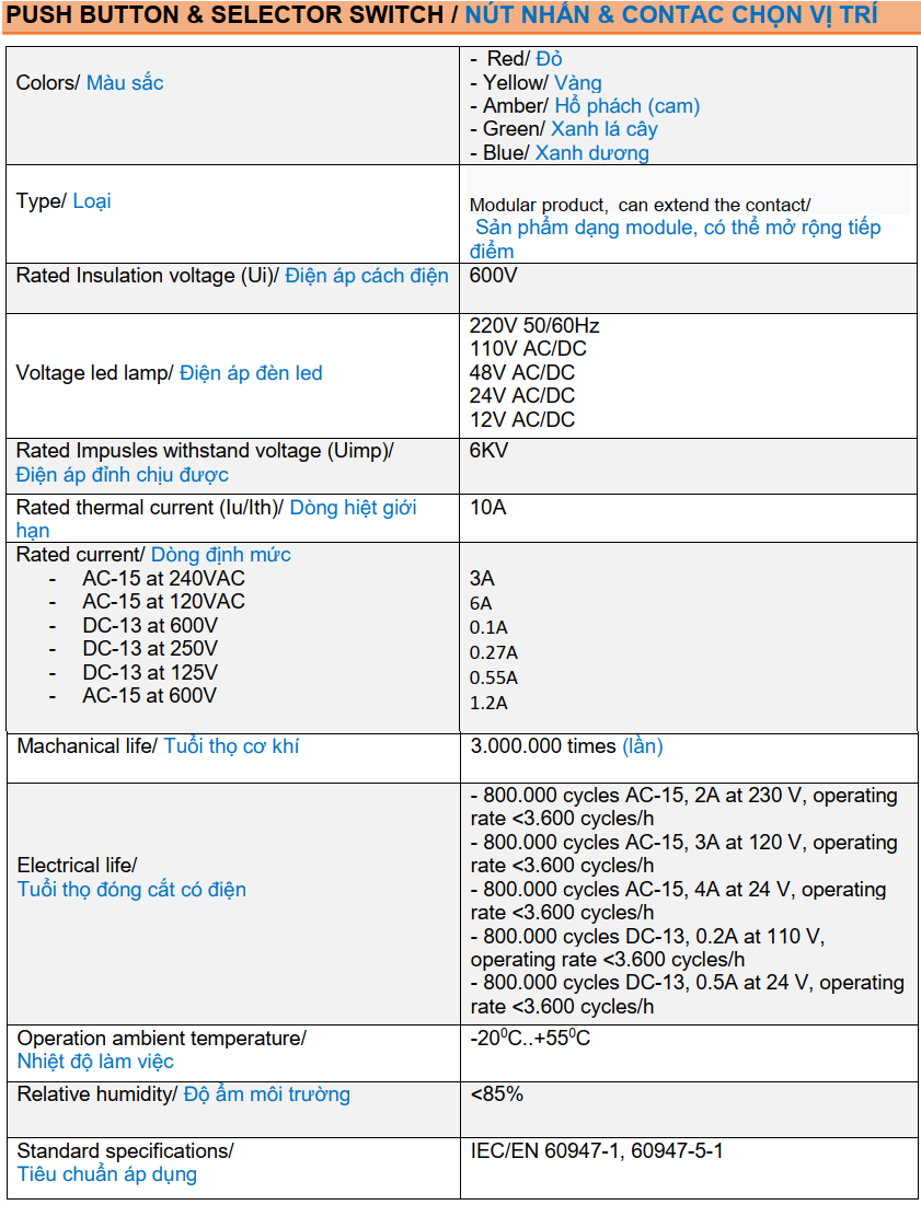 - Tiêu chuẩn áp dụng : IEC/EN 60947-1, 60947-5-1