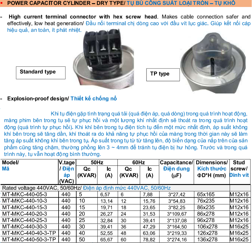 - Tụ bù loại tròn 3 pha điện áp 440V gồm các dãi công suất: 10KVAr, 15KVAr, 20KVAr, 25KVAr, 30KVAr 40KVAr 50KVAr