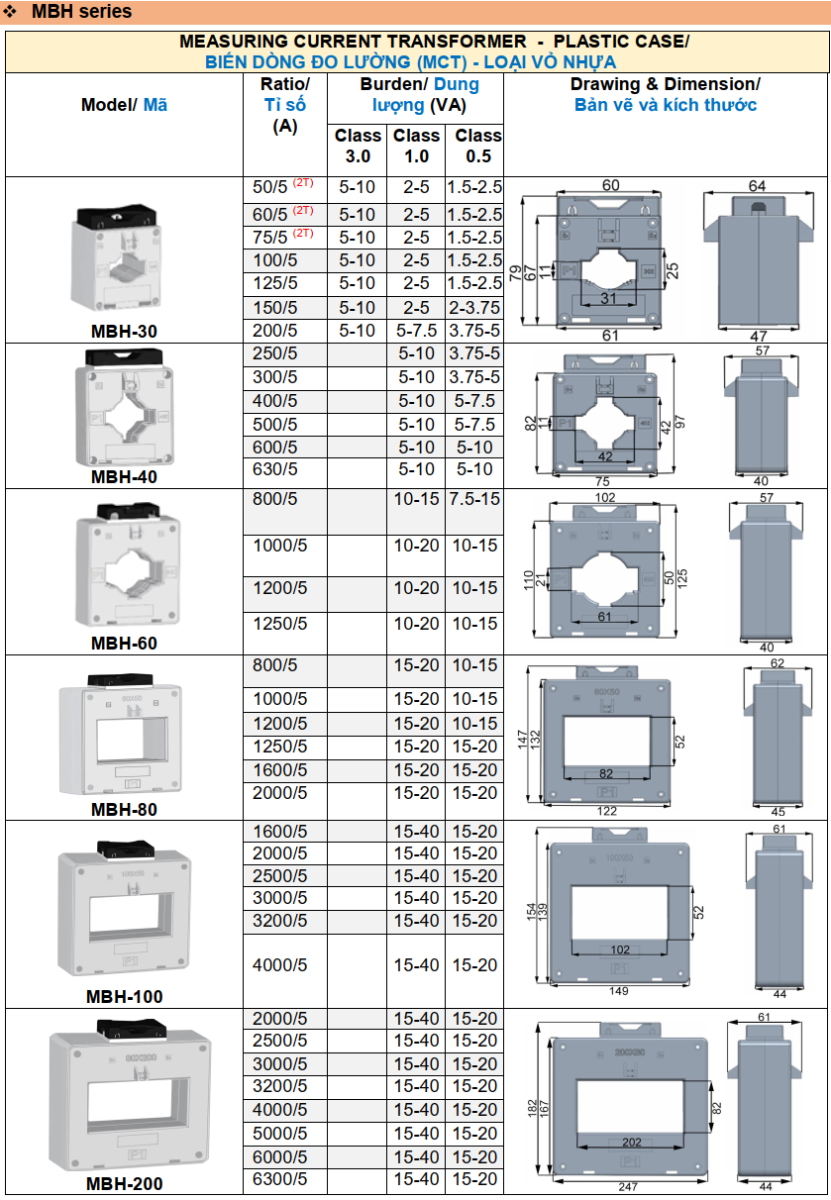 Thông số Biến dòng hộp nhựa loại MBH của MASTER: