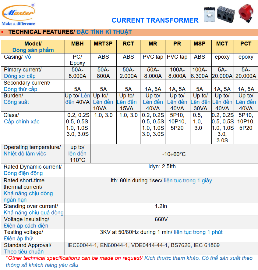 - Tiêu chuẩn áp dụng : IEC60044-1, IEC61869, EN60044-1, VDEO414-44-1, BS7626,