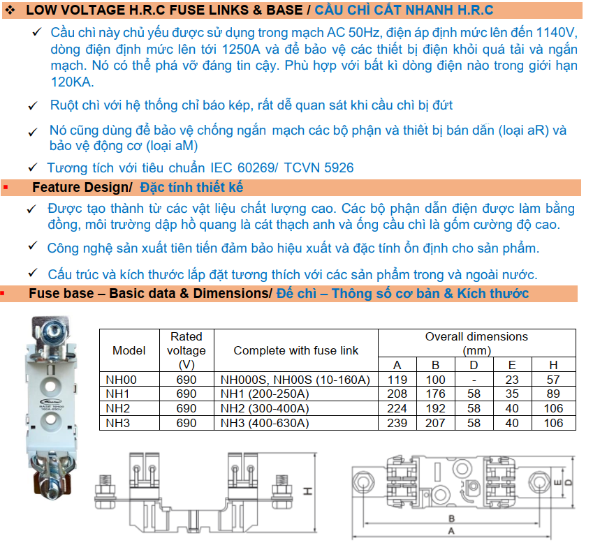 - Lắp với cầu chì H.R.C model NH000S & NH00S