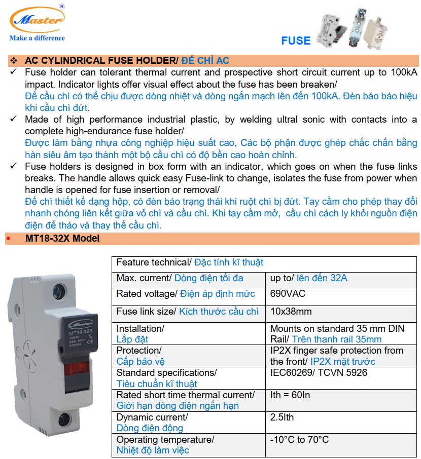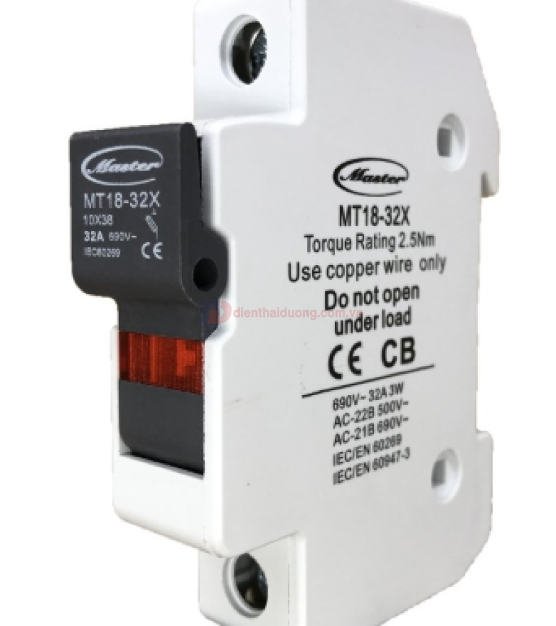 - Sử dụng với cầu chì ống size: 10x38, dòng max: 32 A.
