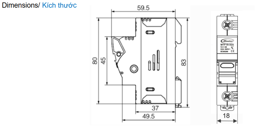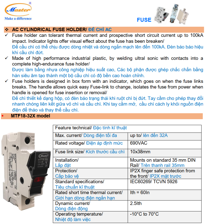 - Sử dụng với cầu chì ống size: 10x38, dòng max: 32 A.