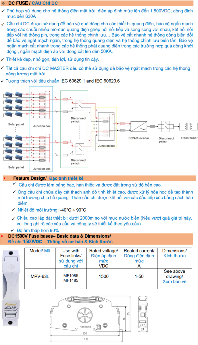 Vỏ ( đế ) cầu chì MASTER có điện áp 1500VDC MPV-63L